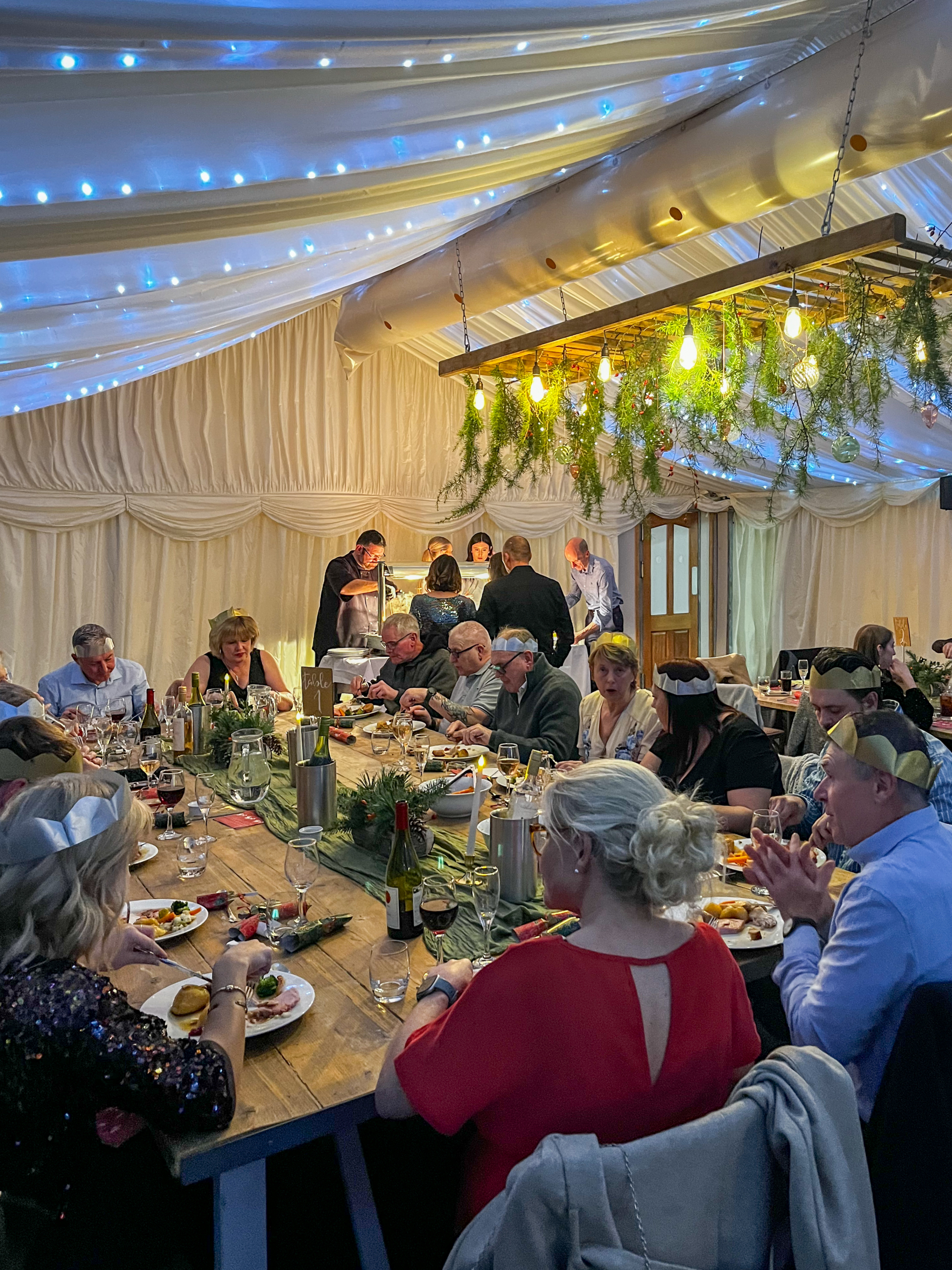 A warm and welcoming feast with music and mingling.
