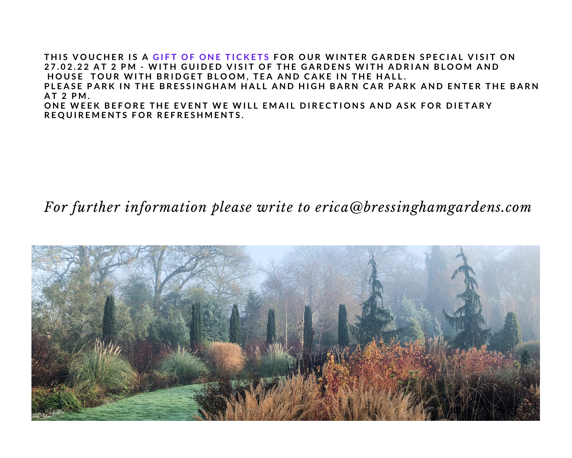 On Sunday afternoon 2pm, the 15 February 2026, behind the scenes guided tour of the award winning Winter Garden and Foggy Bottom with Adrian Bloom, followed by a guided tour of Bressingham Hall – the Georgian manor and former home of Alan Bloom – with tea, coffee and cake. The price includes garden entry, refreshments and guided tours. Allow 3,5 hours.