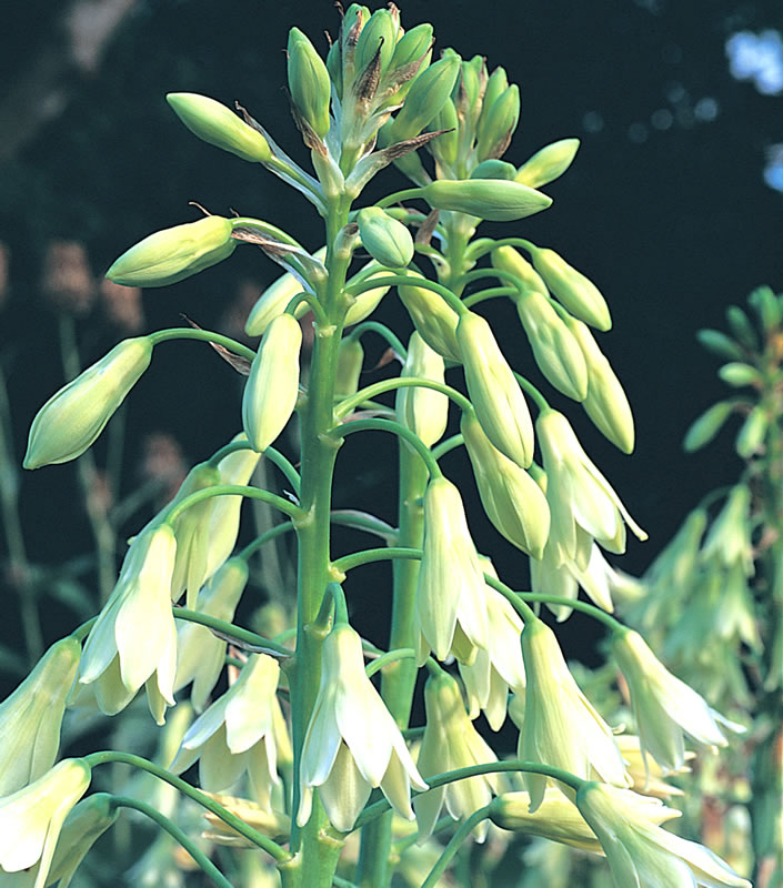 A relative of the “Lily”, this bulbous perennial adds a cool contrast to hotter colours, with rather lax glaucous leaves, and light green spikes carrying gracefully pendent green tinged flowers. Fragrant and good for cutting. Sun and good drainage.