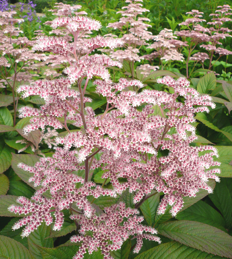 Bold and vigorous this form obtained from Castlewellan Gardens creates a large mound of huge, deeply lobed, bronze tinted leaves with red stems bearing branched panicles of white and pink flowers with a red centre.